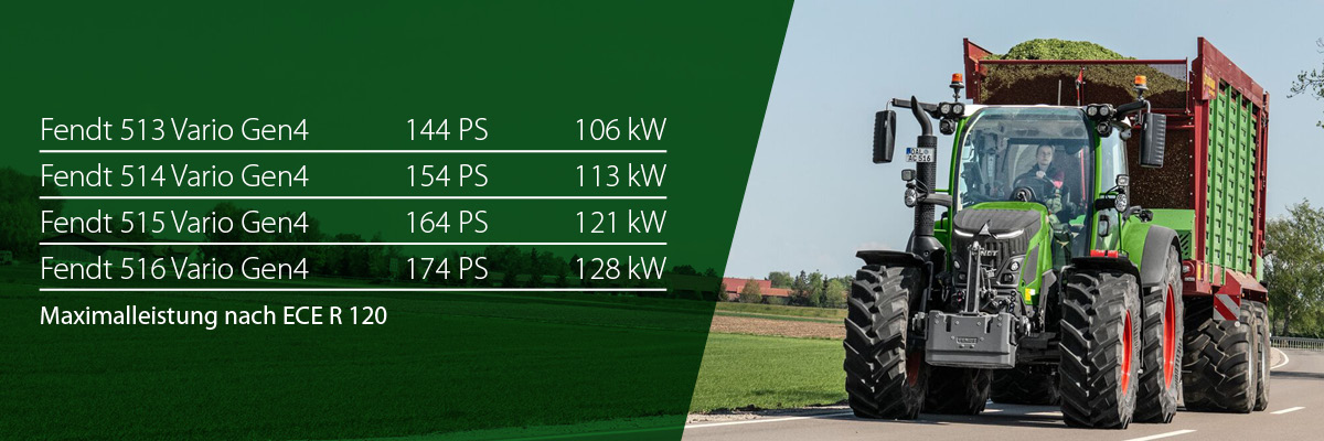 Die komplette neu entwickelte vierte Generation der Baureihe Fendt 500 Vario ist auf hohe Nutz- und Stützlast ausgelegt und deckt den Leistungsbereich von 134 bis 164 PS (99 - 121 kW). Alle Maschinen werden von dem AGCO Power CORE50 Motor angetrieben und sind mit Fendt DynamicPerformance und VarioDrive ausgestattet.
