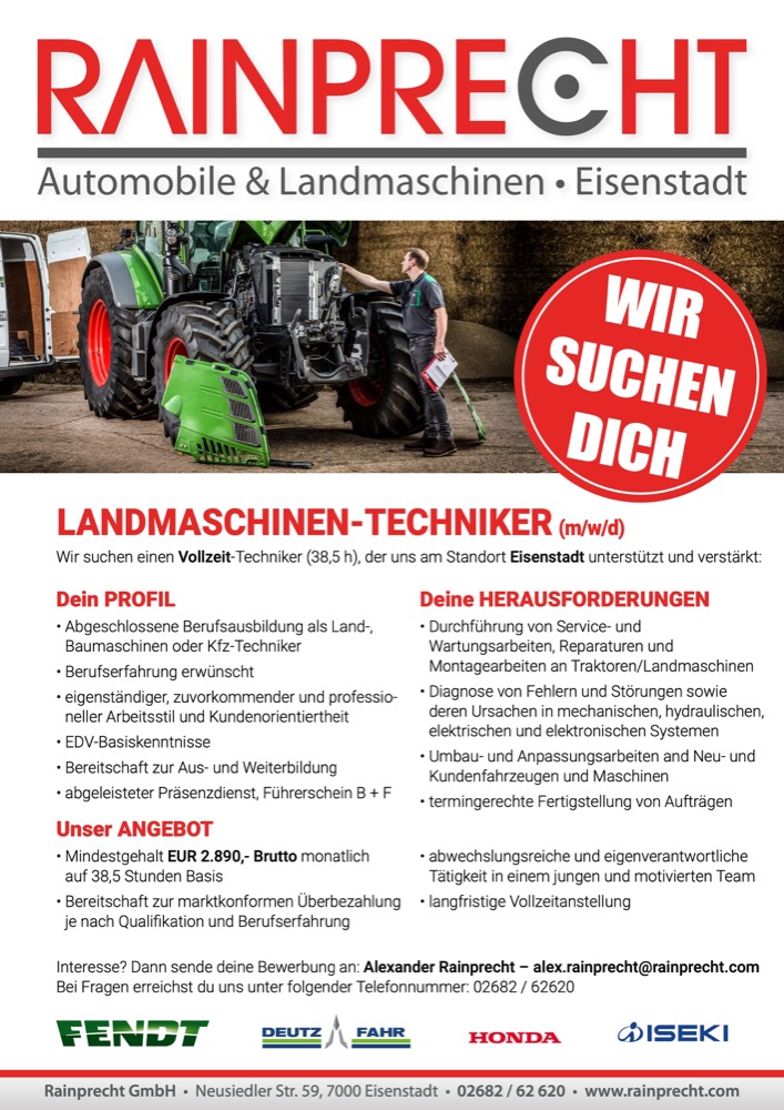 Die Firma Rainprecht ist in Eisenstadt seit 1955 ein Begriff für Landmaschinen und Autoelektrik. Die Produkte von HONDA machen uns seit 1982 weit über die Grenzen des Burgenlandes hinaus bekannt. Auch für Traktoren sind wir seit 1959 ein verlässlicher Partner in der Region. Unser Betrieb zeichnet sich durch langjährige, bestens ausgebildete Mitarbeiter und familiäre Atmosphäre aus.